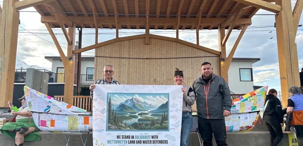 “Estamos orgulhosos de regressar a Smithers — no território tradicional não cedido da nação Wet’suweten — para expressar a nossa solidariedade com Sleydo’, Shaylynn Sampson e Corey Jocko, que foram injustamente criminalizados pelo Canadá por exercerem os seus direitos”
